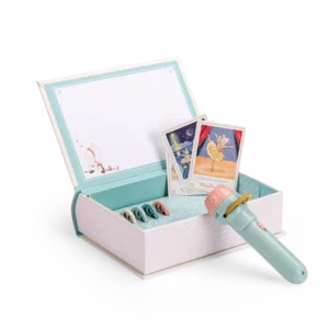 Ova divna magnetna kutija, dizajnirana kao knjiga sadrži lampu za projektovanje sa 5 ilustrovanih bajkovitih priča iz kolekcije La Petite Ecole de Danse i dragocjene pozivnice za predstave, u obliku mini razglednica.