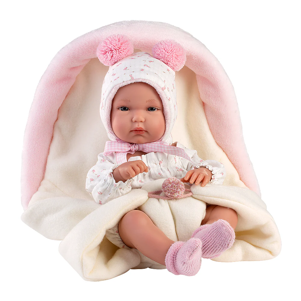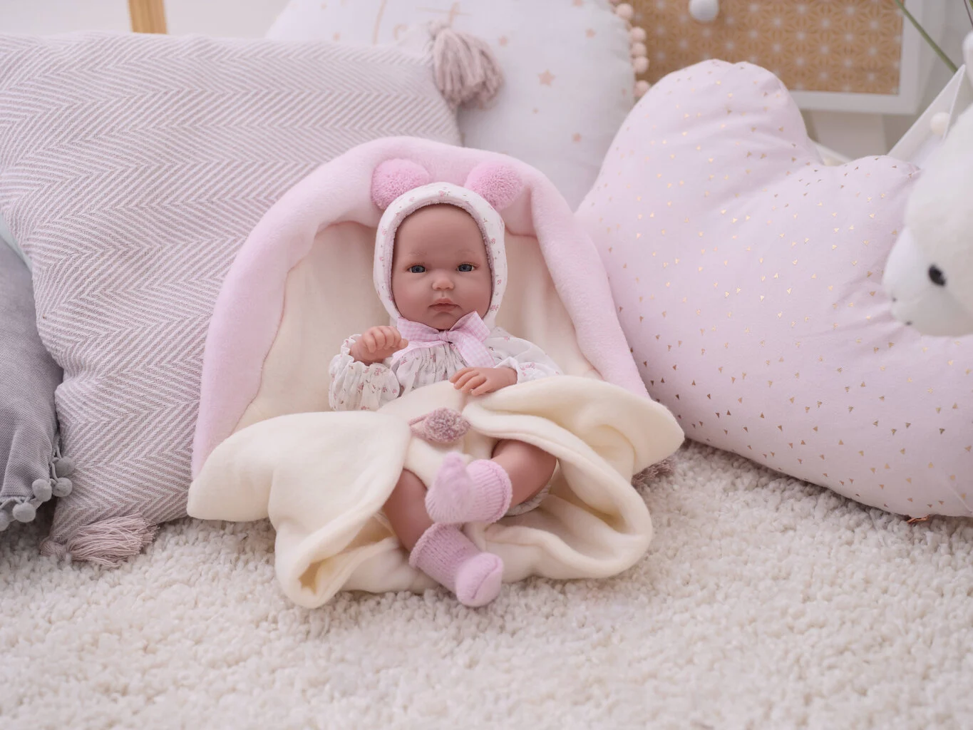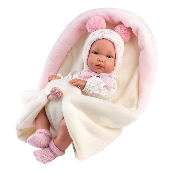 Sa visinom od 35 cm, savršena je za male ruke, a njena odjeća u nježnoj roze boji sa sitnim cvjetićima i slatka kapa sa pufnastim pomponima odražavaju pažljiv ručni rad u svakom detalju. Vreća za spavanje, napravljena od mekanog materijala, pruža udobnost i toplinu, a vinilno tijelo je izdržljivo i lako za čišćenje, što omogućava neprekidnu igru. Bebino nježno i umirujuće lice čini je idealnom za uspavljivanje.