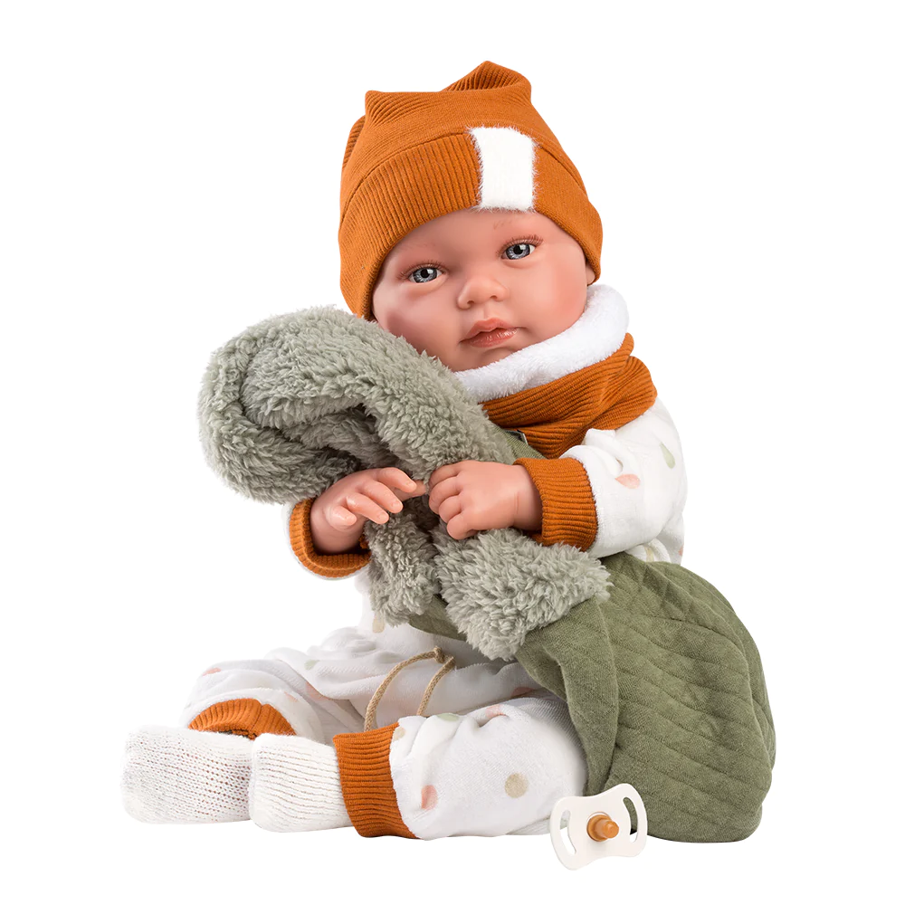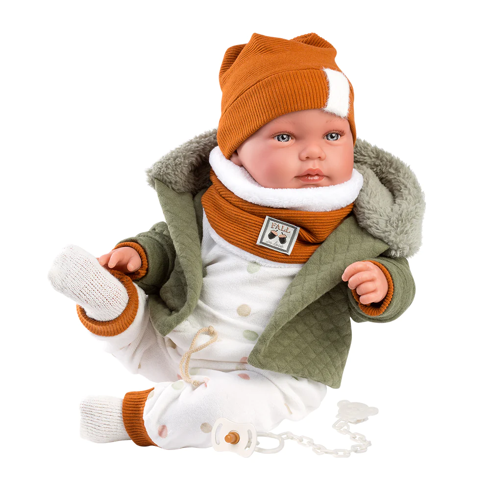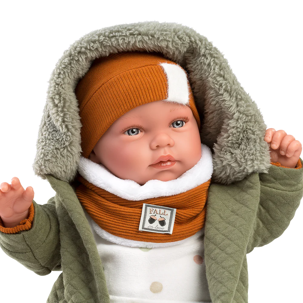 Ova preslatka Llorens beba spremna je osvojiti srca vaših mališana! Obučena u mekani komplet i maslinasto zelenu jaknicu koja joj daje poseban šarm, ova beba jednostavno zrači nježnošću.