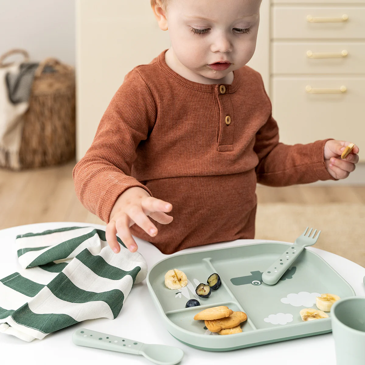 U nježnoj zelenoj boji, tanjir je ukrašen zabavnim motivom krokodila Croca koji s pažnjom posmatra male svitce. Croco će podstaći znatiželju vašeg mališana i motivisati ga na istraživanje hrane na tanjiru. Tamnija baza stvara lijep efekt koji upotpunjuje dizajn.