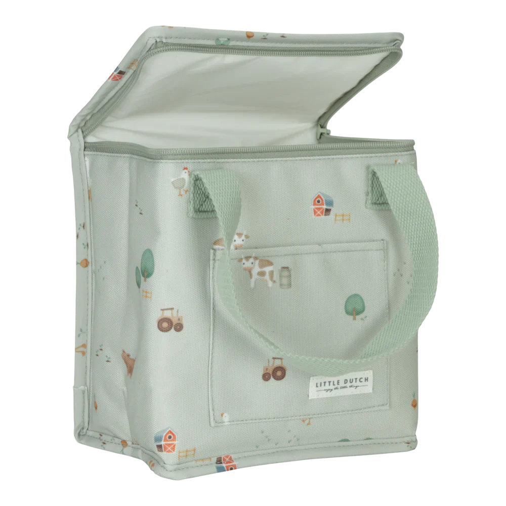 Napravljena od izdržljivog platna sa simpatičnim motivima farme, ova termo torba održava hranu i piće hladnim, savršeno za piknik, školu ili izlet. Unutrašnjost je termoizolovana, što omogućava da vaš obrok, užina i napitak ostanu svježi. Glavni dio torbe pruža dovoljno prostora za kutiju za ručak, flašicu vode i voće, dok prednji džepić može da čuva keks ili drugu manju užinu. Praktične ručke omogućavaju lako nošenje, tako da vaša termo torba može da ide svuda sa vama.